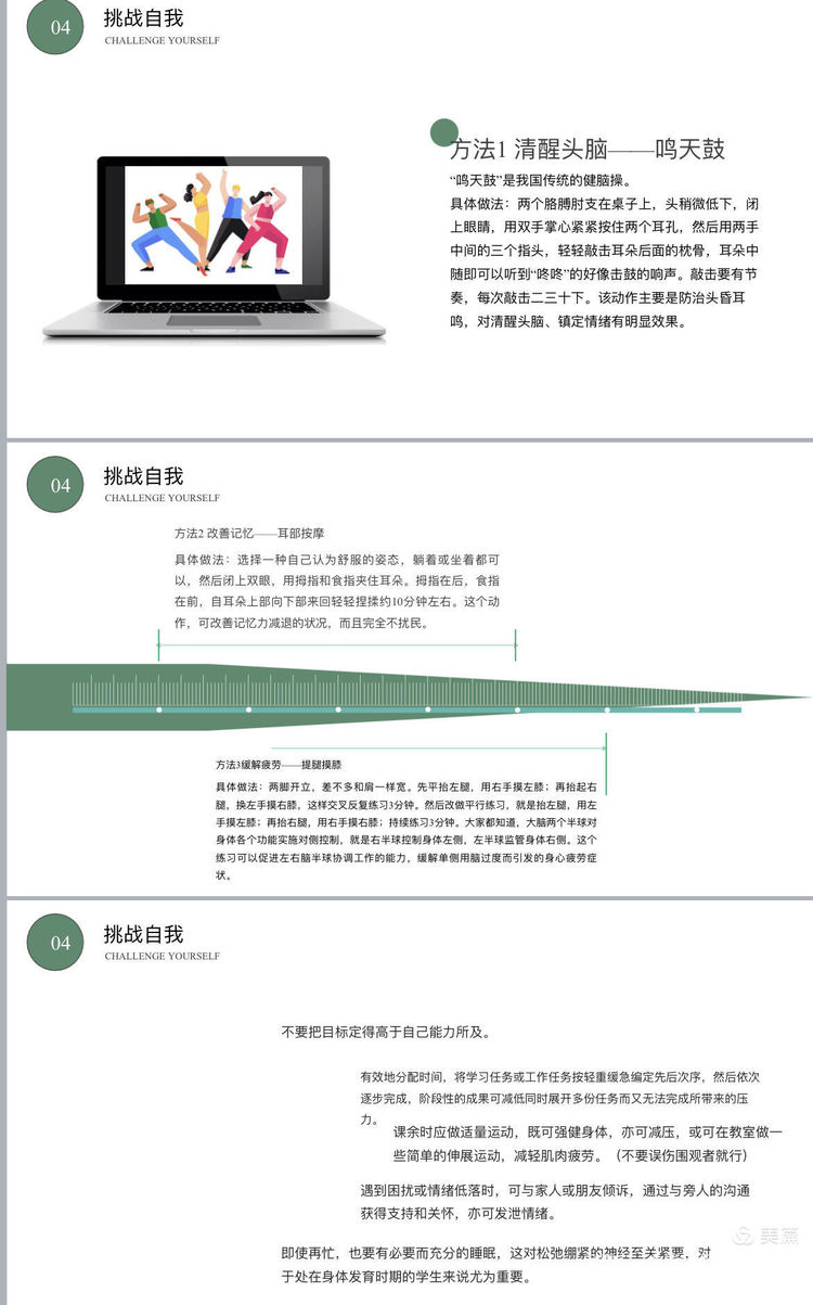 通过挑战自我,希望同学们能明白:要想背负压力走得久,就要懂得适当地放下,调整放松,选择合适的方式来减轻自己的压力。