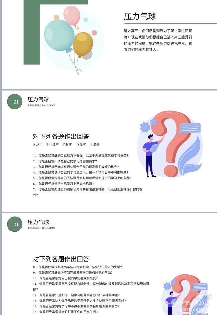 通过压力气球压力图画的方式,同学们了解自己的压力来源,对自己所受压力的程度有一个定位,从而正视压力。并通过分享人生故事,同学们知道:有压力正常,但不能让过分的压力将自己的目标挤出人生之外!